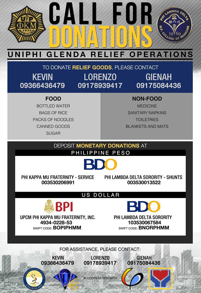 The Phi Kappa Mu Fraternity and the Phi Lambda Delta Sorority of the UP College of Medicine are NOW ACCEPTING DONATIONS for the victims of Typhoon Glenda!